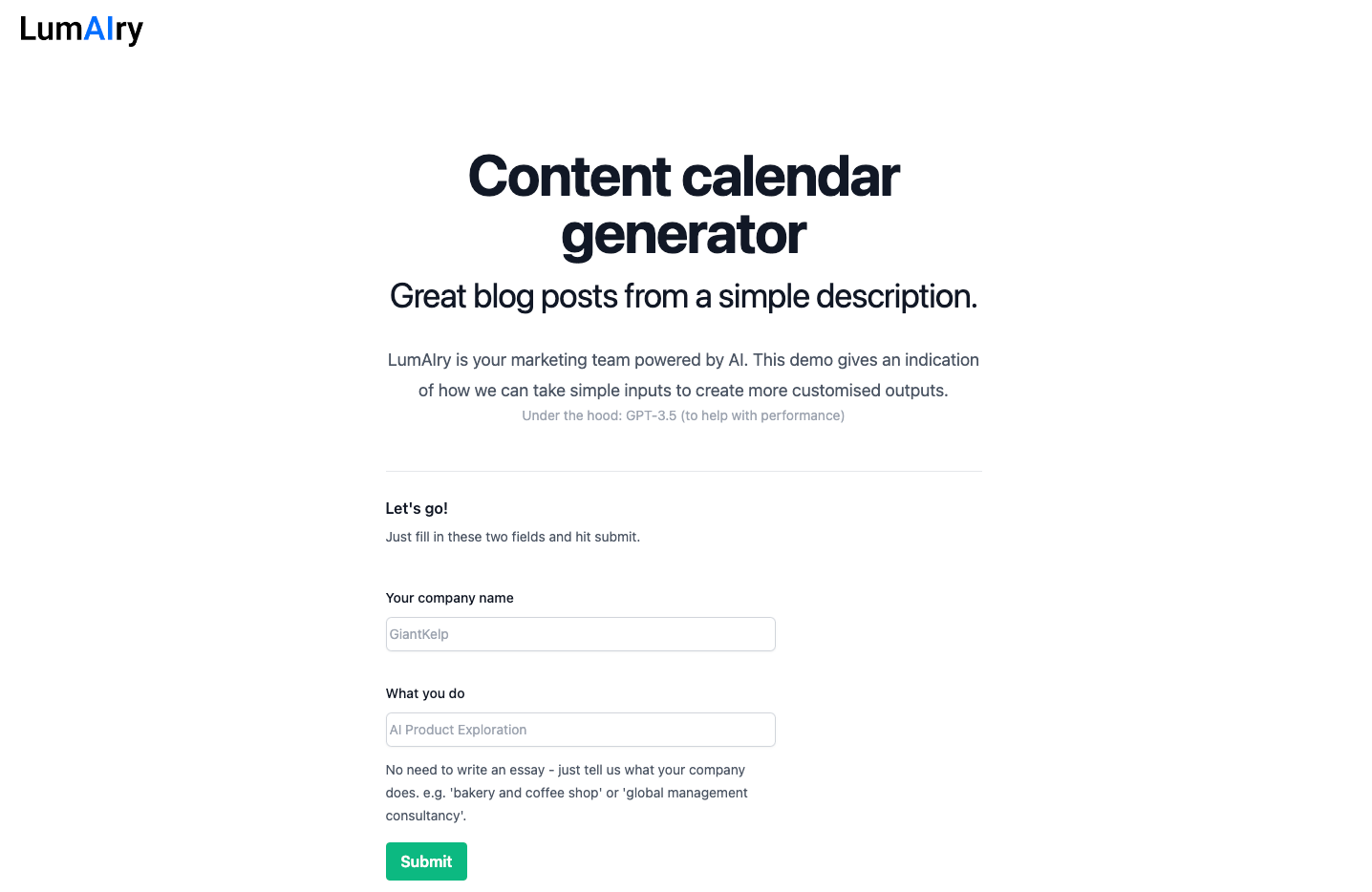In this prototype, LumAIry is designed to generate two blog posts per week for two weeks. Earlier versions produced much longer output but the delay in response made the system relatively unusable as a web app. We've also launched with GPT-3.5 purely to keep speed on response down.